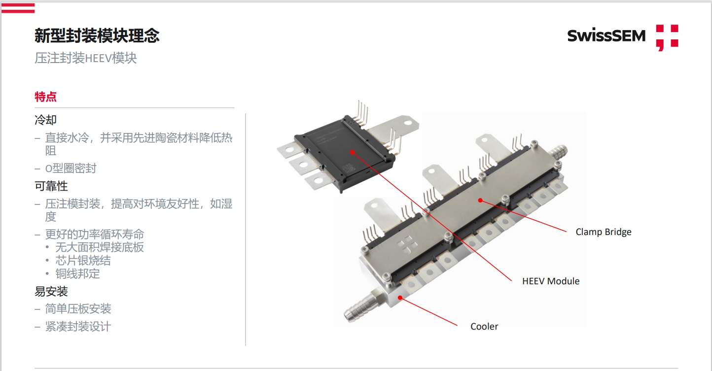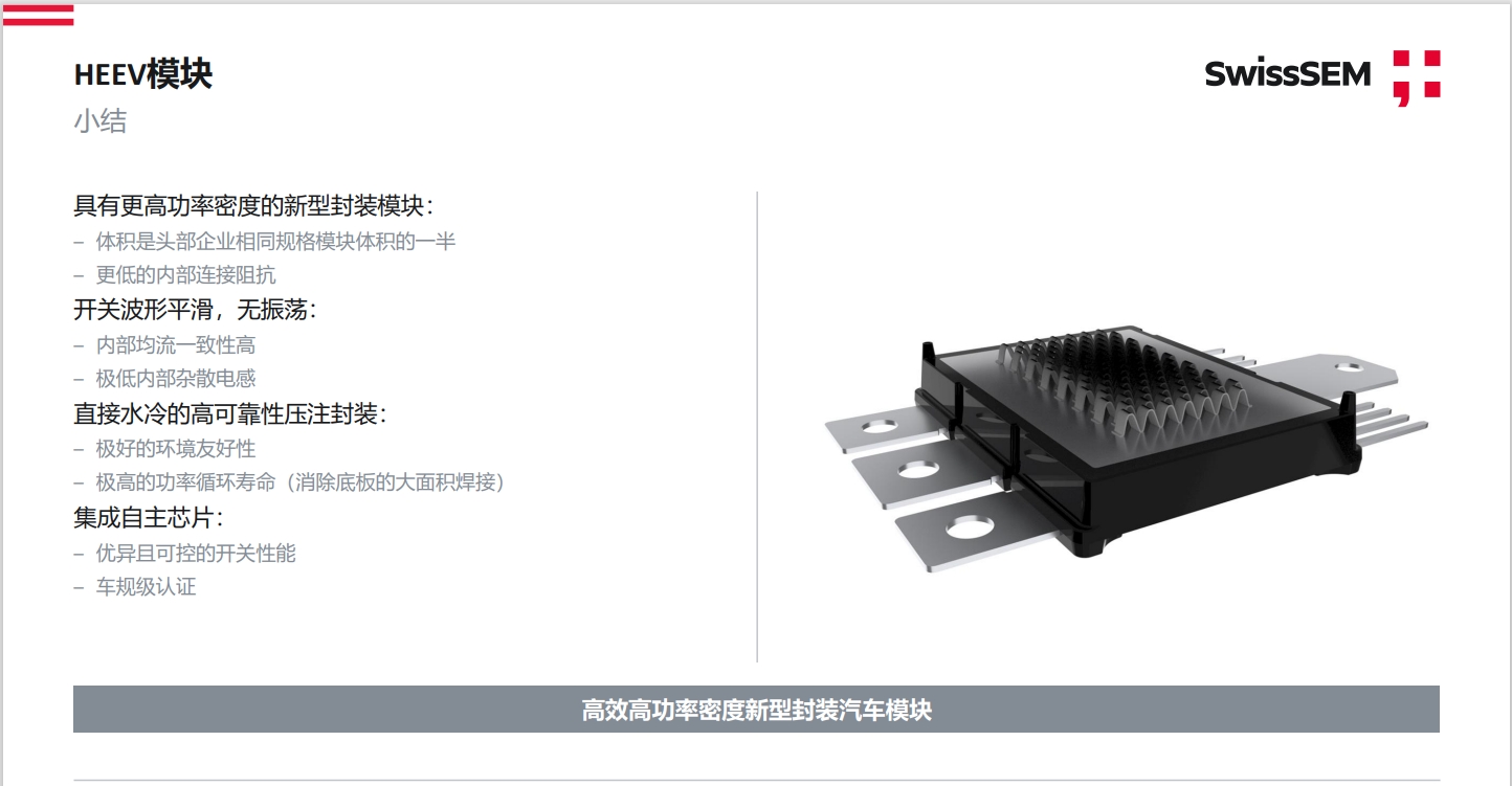 HEEV封装SiC模块具有低杂感、体积小等特点,能够将SiC芯片的性能得到更充分的发挥,助力客户实现高达250kW最紧凑电驱的实现。