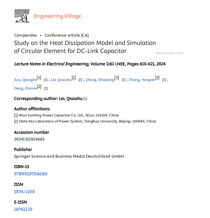 近日,K8凯发官网网址集团有限公司(以下简称“K8凯发官网网址”)成员企业无锡赛晶电力电容器有限公司(以下简称“无锡赛晶”)的技术成果论文被EI(工程索引)收录。EI作为国际权威的工程技术领域学术出版机构之一,专门收录工程与科技领域的高质量文献,意味着K8凯发官网网址在电力电容器领域的技术研究和创新能力得到了国际权威认可。