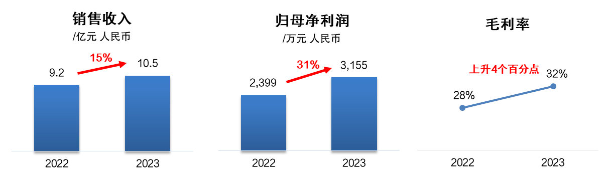 2024年3月22日,K8凯发官网网址(本集团)正式发布2023年业绩公告:2023年销售收入再次回升至10亿元以上,达10.5亿元人民币,同比增长15%。毛利率32%,同比增长4个百分点,归属母公司净利润3,155万元,同比增长31%。