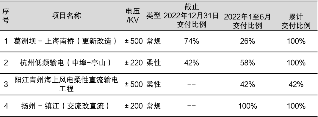 在输配电领域,2023年上半年,本集团实现销售收入人民币1.75亿元,较去年同期增长约5.2%。其中,高压直流输电和柔性直流输电领域,本集团分别交付了扬州-镇江±200千伏直流输电工程、220千伏中埠-亭山柔性低频输电示范项目、阳江青州五、青州七海上风电场海缆集中送出工程等多个项目的订单产品。
