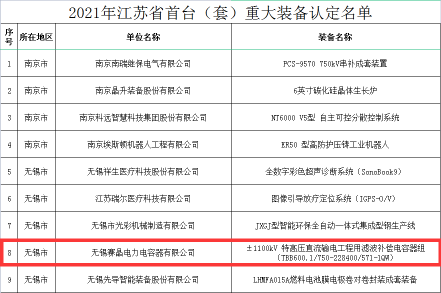 近日,江苏省工业和信息化厅发布了关于2021年江苏省首台(套)重大装备认定名单。K8凯发官网网址成员企业无锡赛晶电力电容器有限公司(以下简称:无锡赛晶)研发生产的“±1100kV 特高压直流输电工程用滤波补偿电容器组(TBB600.1/750-228400/571-1QW)”榜上有名。