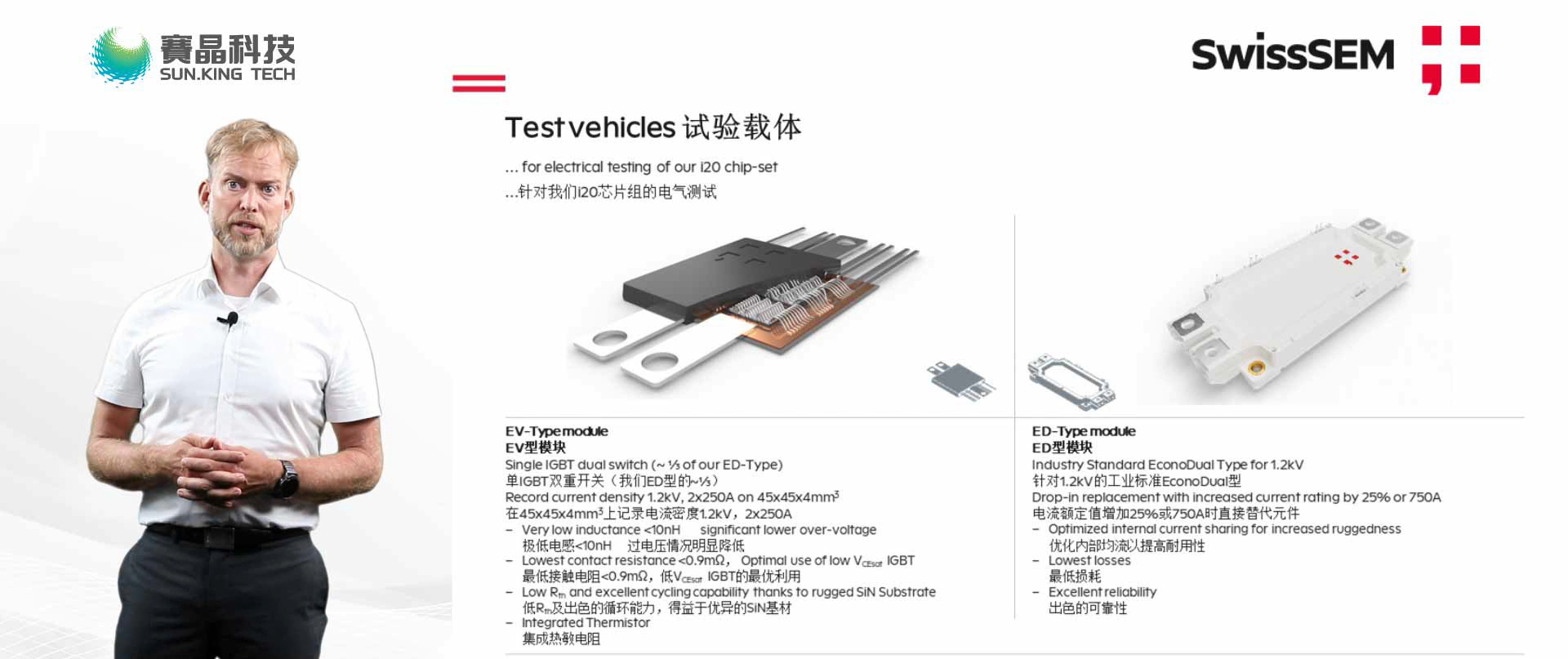 K8凯发官网网址瑞士子公司SwissSEM首席运营官Sven先生,通过视频的方式发表主题报告 “电动汽车和工业领域最先进的IGBT”,首次发布了下一代车载单面冷却IGBT模块——EV-Type模块。