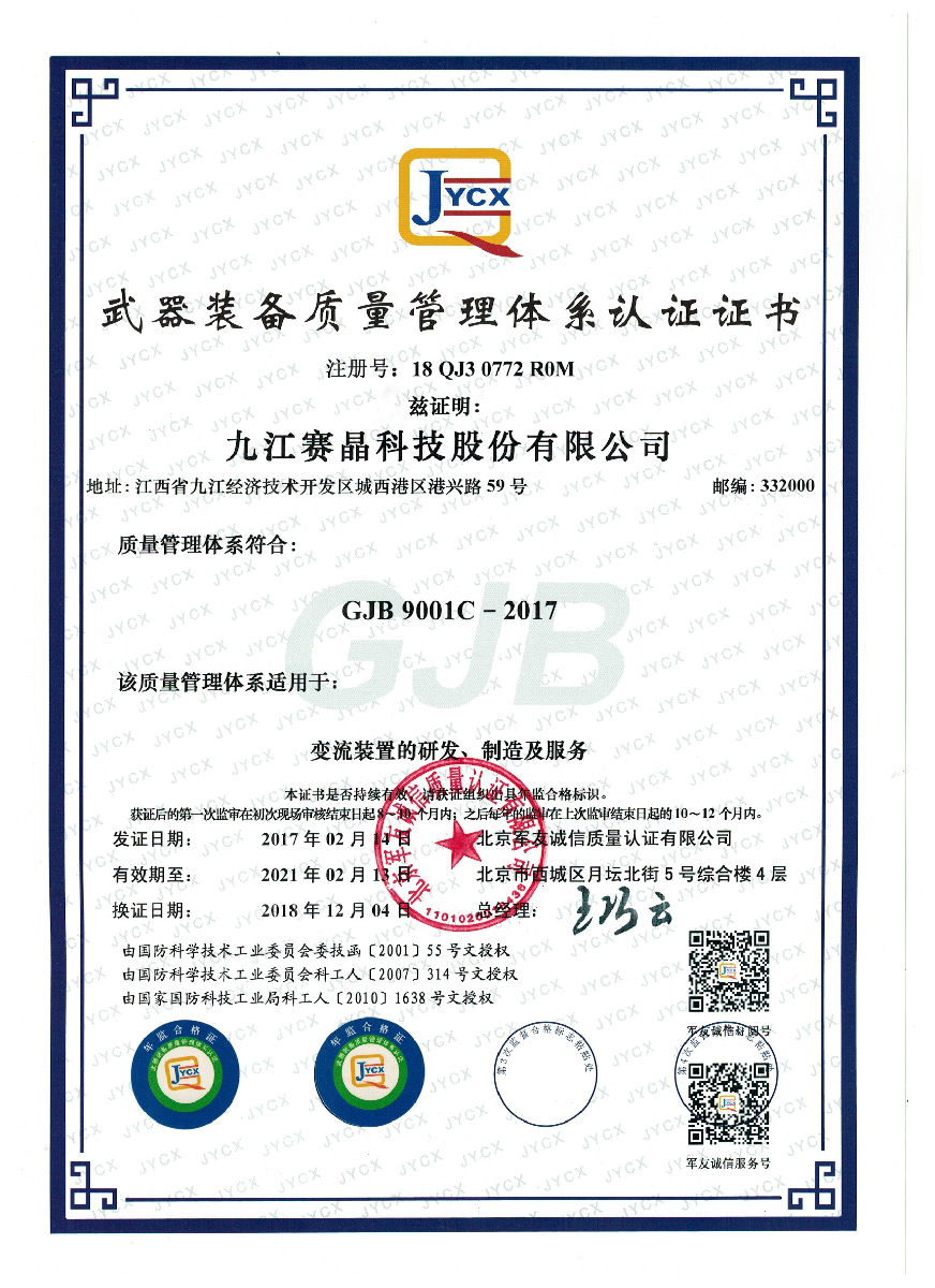 2018年12月4日,九江K8凯发官网网址股份有限公司(以下简称九江赛晶)顺利获得军标和民标双体系质量管理体系证书。