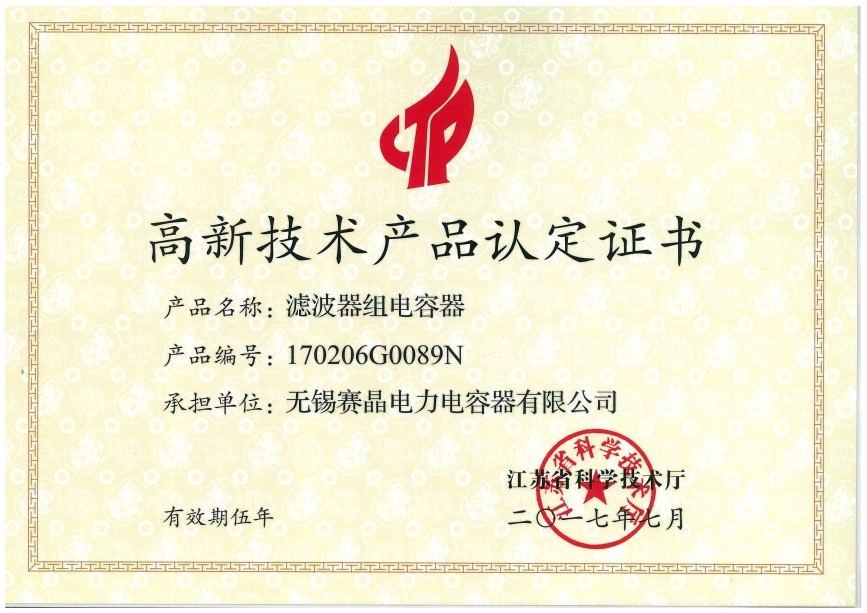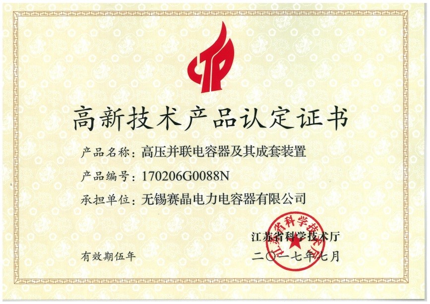 2017年4月,赛晶集团下属子公司无锡赛晶电力电容器有限公司(以下简称无锡赛晶)申报两项高新技术产品:高压并联电容器及其成套装置和滤波器组电容器,于2017年7月顺利通过江苏省科学技术厅的认定,获得高新技术产品认定证书,有效期为五年。
