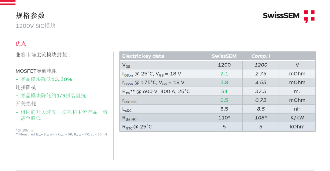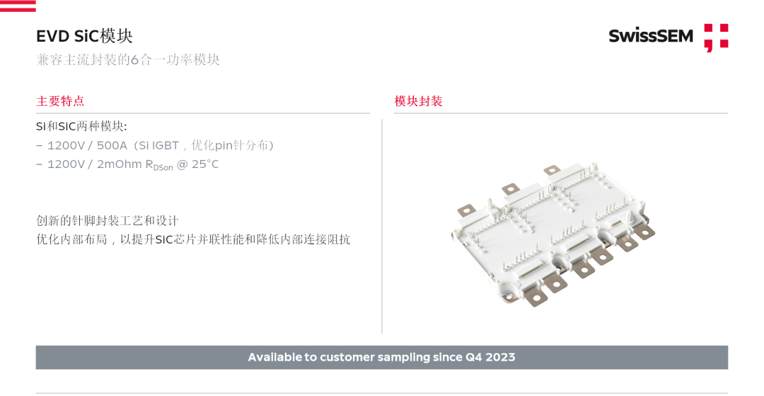 EVD封装SiC模块通过优化内部布局,采用创新的针脚封装和工艺设计,赛晶模块MOSFET导通电阻降低10%~30%、封装阻抗降低约1/3。EVD封装产品有Si和SiC两种类型,该产品可以让客户能够最大可能的借鉴既有Si产品的系统设计,同时可以有灵活的商务供应。