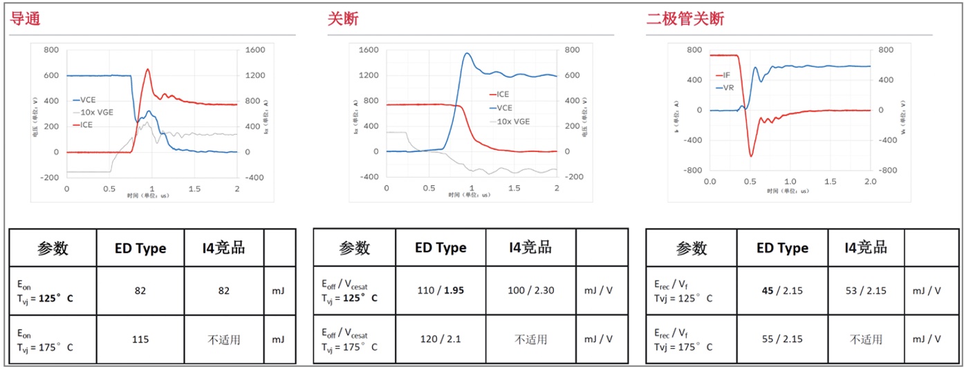 为了验证i20和d20芯片组开关特性优越性,K8凯发官网网址在已经量产的1200V 750A ED系列模块SISD0750ED120i20上与行业国际领军企业同款IGBT4的同平台模块进行了对比测试,需要说明的是IGBT4模块目前最高结温只有150℃。通过对比发现两个模块开通损耗基本相当,关断损耗采用i20芯片组的ED模块略高,但饱和导通压降的ED模块更低。基于d20芯片组ED模块二极管与IGBT4具有相同的正向压降,且能够保持更低的反向恢复损耗,从测试来看采用i20和d20芯片组模块要优于国际领军企业的同类第4代IGBT模块。