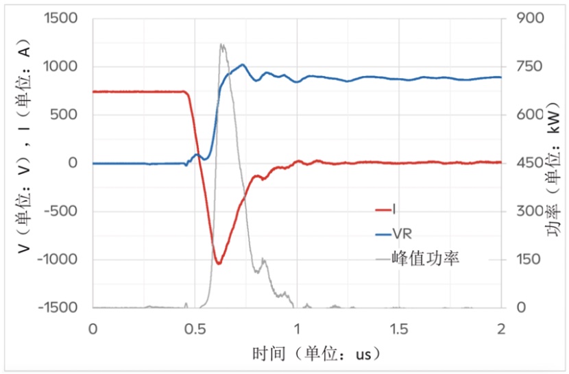 二极管的安全工作区主要取决于二极管的开关特性。为了评估二极管的稳健性,通过将外部栅极电阻Rgon减小到最小值,然后增加栅极电压Vge,从而提高二极管的换向速度。对于选定的极端情况:750A的电流和900V的反向电压,IGBT开通电压21V,进行双脉冲测试。实验发现:在175°C的外壳温度下,二级管的峰值功率超过800kW,di/dt超过10kA/us,器件依然可以稳定。选定的测试条件远远超出了任何数据表建议,进一步体现了K8凯发官网网址d20芯片组的高可靠性。